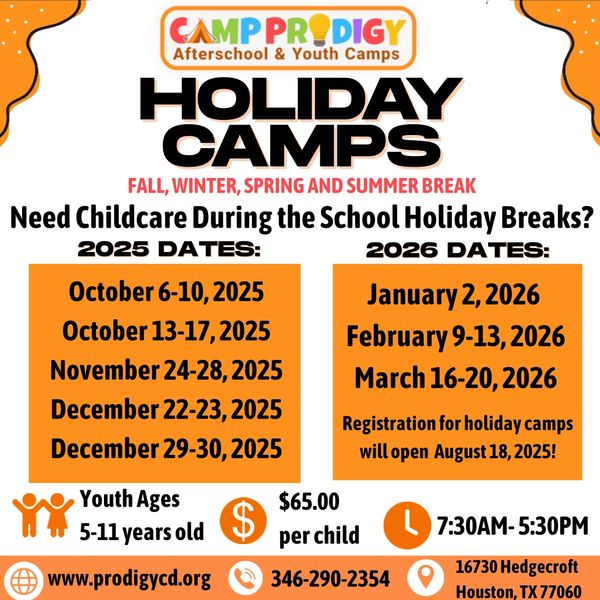 When school takes a break, Camp Prodigy Holiday Camps step in to provide a safe, structured, and fun-filled environment for children ages 5–11. Whether it's winter break, spring break, or in-service days, our Holiday Camps are the perfect solution for working families who want meaningful experiences for their children when school is closed.