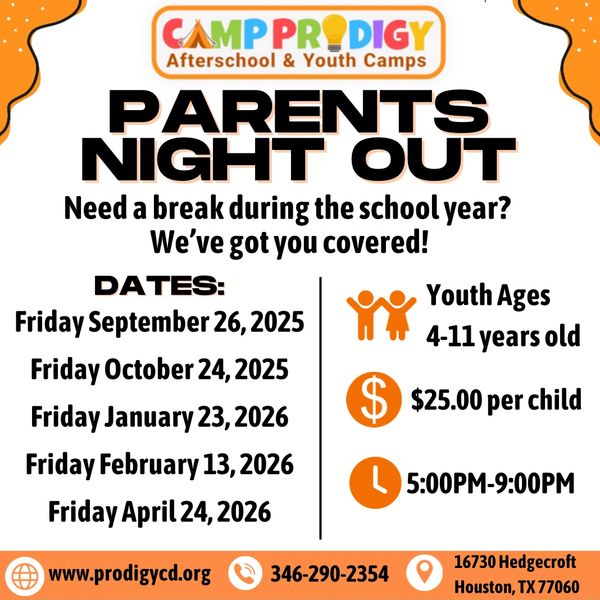 Need a few hours to relax, run errands, or enjoy a date night? Camp Prodigy’s Parents' Night Out is the perfect solution! Drop the kids off for an evening of supervised fun while you enjoy well-deserved time for yourself.